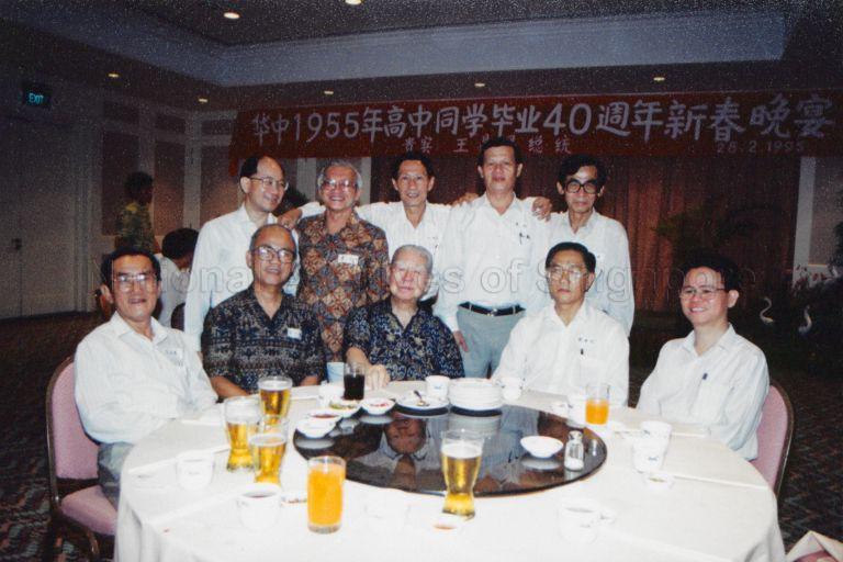 THE CHINESE HIGH SCHOOL CLASS 1955 ALUMNI 40TH ANNIVERSARY CELEBRATION, FEB 1995. GROUP PHOTO OF OLD BOYS WITH THEIR FORMER TEACHER, LIU KANG (SEATED CENTRE)