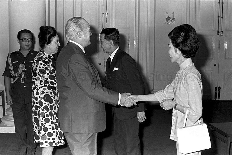 PREMIER OF NEW SOUTH WALES SIR ROBERT ASKIN (THIRD LEFT) AND LADY ASKIN (SECOND LEFT) CALLS ON PRESIDENT DR BENJAMIN HENRY SHEARES AND FIRST LADY AT ISTANA NEGARA. THEY ARE HERE FOR A THREE-DAY VISIT TO THE REPUBLIC