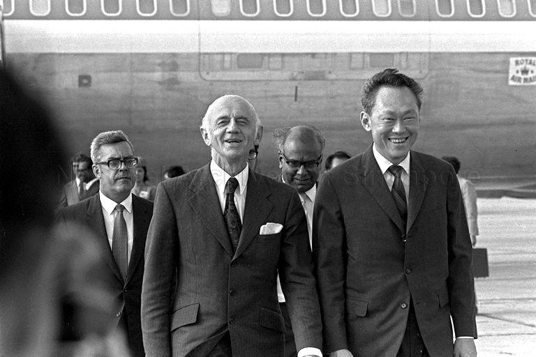 ARRIVAL OF AUSTRALIA'S PRIME MINISTER (PM) WILLIAM MCMAHON (SECOND FROM LEFT) AT THE SINGAPORE AIRPORT. HE WAS GREETED BY PM LEE KUAN YEW (RIGHT). THE AUSTRALIAN PM IS HERE FOR TOP LEVEL CONSULTATIONS ON BILATERAL AND REGIONAL AFFAIRS. BEHIND THEM ARE N F PARKINSON (LEFT), AUSTRALIAN HIGH COMMISSIONER AND A P RAJAH (SECOND FROM RIGHT) SINGAPORE'S HIGH COMMISSIONER TO AUSTRALIA.