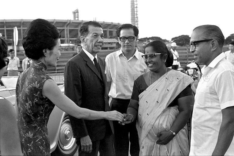PRESIDENT DR BENJAMIN HENRY SHEARES (SECOND LEFT) AND MRS SHEARES (LEFT) GREET SECRETARY-GENERAL OF NATIONAL TRADES UNION CONGRESS C V DEVAN NAIR (RIGHT) AND MRS NAIR AT AN EVENING OF FUN AND GAMES AT THE PESTA SUKAN MAY DAY. THE PRESIDENT OPENED THE MAY DAY CELEBRATIONS AT THE WONDERLAND AMUSEMENT PARK AT KALLANG. THE CARNIVAL ATTRACTED THOUSANDS OF WORKERS AND THEIR FAMILIES TO THE TWO-DAY FOOD AND FUN FAIR