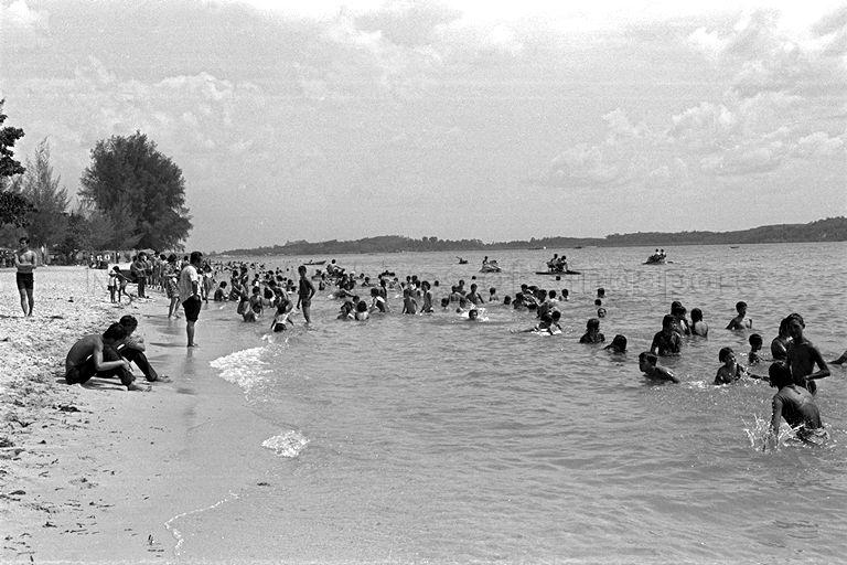 OIL POLLUTION AT CHANGI BEACH CAUSED BY SHELL SUPERTANKER MYRTEA, WHICH RAN AGROUND OFF PULAU BUKOM HAS BEEN CLEARED. PICTURE SHOWS HUNDREDS OF WEEKEND REVELLERS BASKING IN THE SUN AND SWIMMING - FREE FROM FEAR OF GREASE AND GRIME