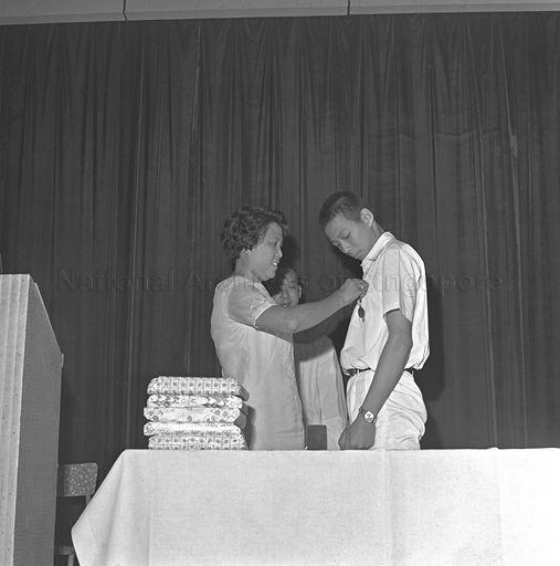 A PROUD MOMENT FOR LEE HSIEN LOONG, ELDER SON OF PRIME MINISTER LEE KUAN YEW, AS HE RECEIVES THE LIM KOON YAW GOLD MEDAL FOR BEING THE BEST ALL-ROUND STUDENT OF CATHOLIC HIGH SCHOOL - A CHINESE HIGH SCHOOL - LAST YEAR. PINNING THE MEDAL IS MRS LIM KOON YAW, WIDOW OF THE DONOR