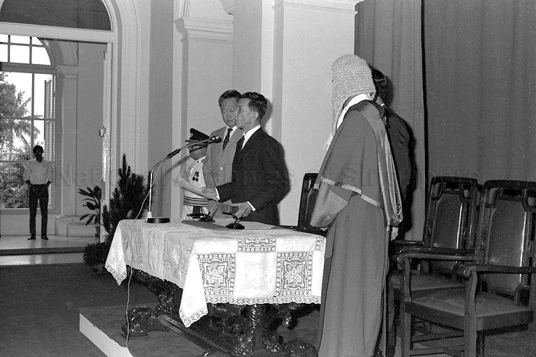 DR BENJAMIN HENRY SHEARES WAS SWORN IN AS NEW PRESIDENT OF SINGAPORE AT ISTANA NEGARA. IN A LOW BUT AUDIBLE VOICE, PRESIDENT DR BENJAMIN HENRY SHEARES WITH HIS LEFT HAND HOLDING THE BIBLE, TOOK TWO OATHS - ONE OF ALLEGIANCE AND ONE FOR THE DUE EXECUTION OF THE OFFICE OF PRESIDENT. OTHERS IN THE PICTURE ARE PRIME MINISTER LEE KUAN YEW (LEFT) AND JUSTICE WEE CHONG JIN (RIGHT).