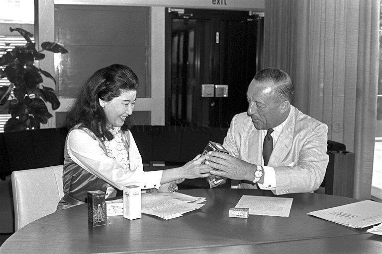 MADE IN SINGAPORE PERFUMES 'TOOK TO THE AIR' TODAY. 3 DIFFERENT SCENTS MANUFACTURED BY PERFUMES OF THE ORIENT, WERE INTRODUCED ABOARD MALAYSIA-SINGAPORE AIRLINES' (MSA) INTERNATIONAL FLIGHTS AS SALES ITEMS FOR THE FIRST TIME. MRS CHRISTINA STONE, CHAIRMAN OF THE PERFUME PLANT SAID THAT THEY HAVE BEEN APPROACHED BY SEVERAL AIRLINES TO INCLUDE THE SCENTS AS INFLIGHT SALES ITEMS. PICTURE SHOWS MRS CHRISTINA STONE (LEFT) PRESENTING MANAGING DIRECTOR OF MSA DAVID CRAIG WITH A BOTTLE OF PERFUME TO MARK THE JOINT VENTURE