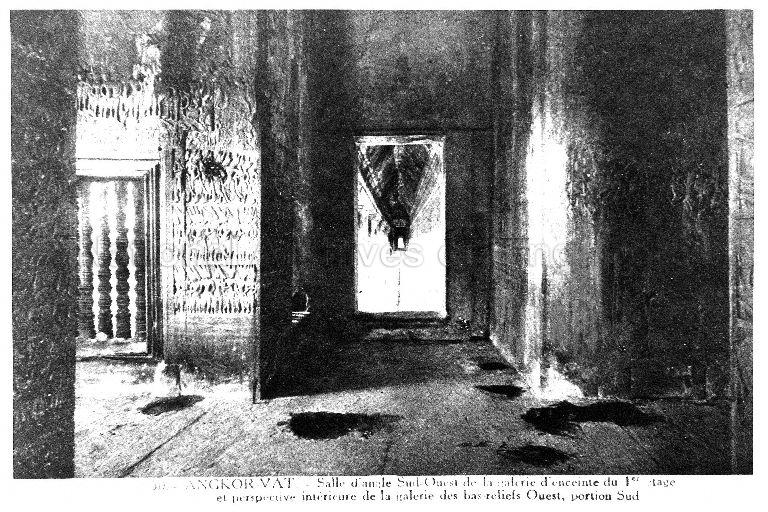 ANGKOR-VAT. ROOM AT THE SOUTHWESTERN ANGLE OF THE GALLERY OF ENCLOSURE ON THE FIRST FLOOR AND THE INTERIOR PERSPECTIVE OF THE GALLERY OF WESTERN BRASS RELIEFS, SOUTHERN SECTION, C1900S