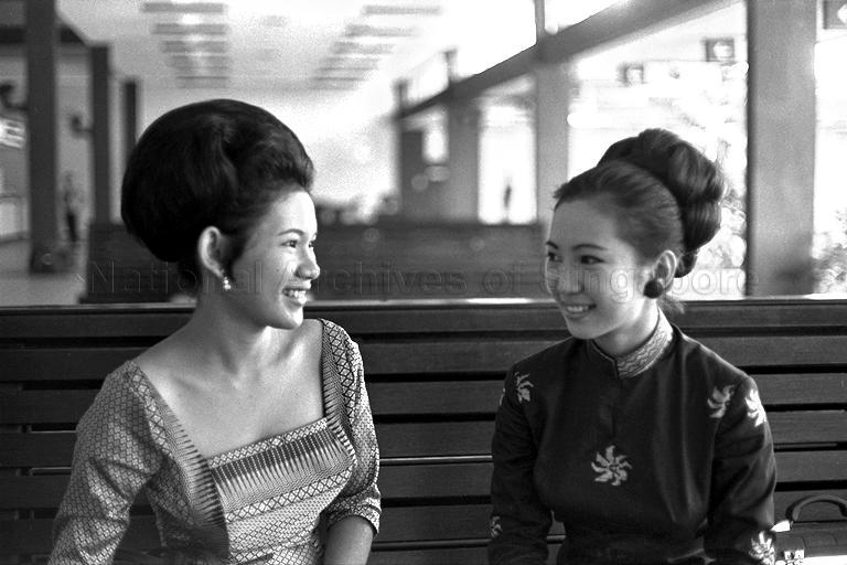 MISS MALAYSIA MAJORIE RONGSANK (LEFT), 20, AND MISS SINGAPORE INTERNATIONAL 1967 MISS ANGELA ATTIAS, 19, LEFT HERE FOR UNITED STATES TO TAKE PART IN THE MISS INTERNATIONAL PAGEANT