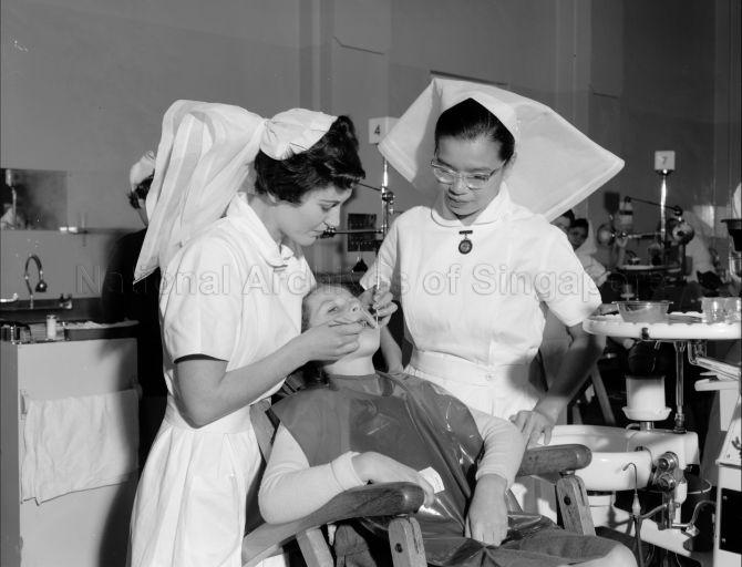 MRS PANSY LIM, DENTAL NURSE FROM SINGAPORE, INSTRUCTS A SENIOR GIRL IN THE DENTAL SURGERY AT THE SCHOOL FOR DENTAL NURSES, WELLINGTON.