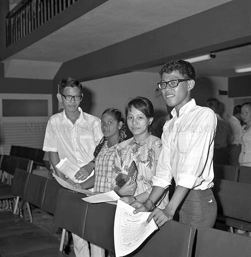 EIGHTY-FOUR STUDENTS FROM FOUR LANGUAGE STREAMS, INCLUDING THREE CHINESE AND ONE INDIAN STUDENT, RECEIVED THEIR BURSARY CERTIFICATES FROM SYED ALI REDHA ALSAGOFF, CHAIRMAN OF PROPHET MUHAMAD'S BIRTHDAY MEMORIAL SCHOLARSHIP FUND BOARD, AT A PRESENTATION CEREMONY AT THE ALL MALAYA MUSLIM MISSIONARY SOCIETY PREMISES IN GEYLANG. FROM LEFT, FOUR OF THIS YEAR'S RECIPIENTS : TEO KOK PONG, STUDENT AT UNIVERSITY OF SINGAPORE, MISS MAGESWARI RAGUNATH GUHA, A SECONDARY SCHOOL STUDENT, CHE AMINAH BINTE ABDUL GANI AND ABDUL AZIZ BIN MOHAMED YATIM, BOTH OF THE UNIVERSITY OF SINGAPORE