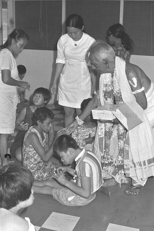 CHILDREN OF THE TAMPINES HOME FOR THE RETARDED CHILDREN CELEBRATING DEEPAVALI. THEY WERE HONOURED BY A SPECIAL VISIT BY DEEPAVALI THATTA (FESTIVAL OF LIGHTS FATHER) WHO DISTRIBUTED CAKES, DRINKS, TOYS AND BALLOONS.