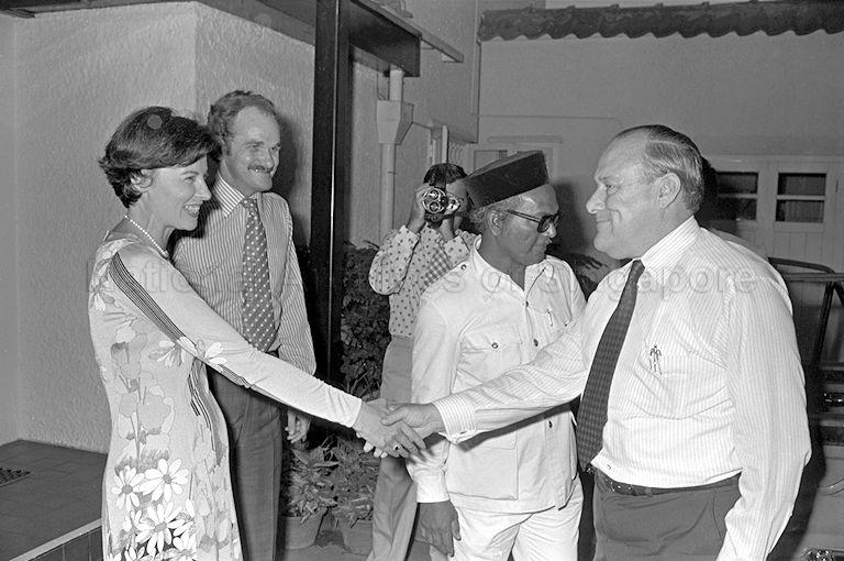 NEW ZEALAND PRIME MINISTER ROBERT MULDOON (RIGHT) ATTENDED A LUNCHEON HELD AT QUEEN ASTRID PARK, RESDIENCE OF NEW ZEALAND HIGH COMMISSIONER GERALD C HENSLEY (SECOND LEFT) AND MRS JULIET HENSLEY (LEFT)
