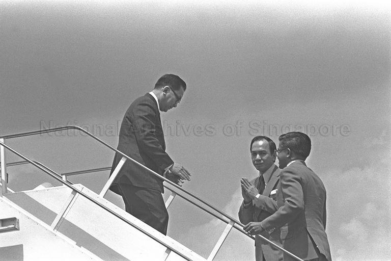 ARRIVAL OF THAI PRIME MINISTER (PM) THANIN KRAIVICHIEN AT PAYA LEBAR AIRPORT. HE DID NOT WAIT TO BE FORMALLY INVITED OUT AS IS NORMALLY DONE DURING VISITS OF HEADS OF GOVERNMENT. BEFORE THAI AMBASSADOR JETN SUCHARITKUL AND DIRECTOR OF PROTOCOL FROM FOREIGN AFFAIRS MINISTRY, V K RAJAN, COULD ENTER THE PLANE TO INVITE PM THANIN OUT, HE WAS ALREADY HALFWAY DOWN THE RAMP. THEY EXCHANGED GREETINGS ON THE RAMP AND PM THANIN WAS LED DOWN THE REST OF THE WAY TO A ' WELCOME TO SINGAPORE' HANDSHAKE FROM PM EE KUAN YEW. PICTURE SHOWS PM THANIN (LEFT) DURING HIS HALFWAY ENCOUNTER WITH JETN SUCHAVITKUL (CENTRE) AND V K RAJAN