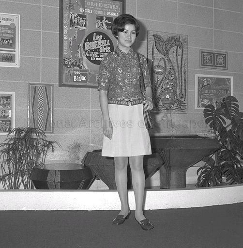 NEW MALAYSIA-SINGAPORE AIRLINES UNIFORMS DESIGNED BY PARIS COUTURIER PIERRE BALMAIN - THE TURQUOISE SUIT AND BATIK BLOUSE WHICH THE FLIGHT AND GROUND STEWARDESSES WILL BE WEARING