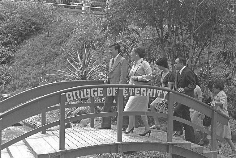 EGYPT'S FIRST LADY MRS JEHAN EL SADAT (CENTRE) AND MEMBERS OF HER ENTOURAGE CROSSING THE BRIDGE OF ETERNITY AT THE JURONG BIRD PARK. SHE IS BEING ESCORTED BY ACTING CHAIRMAN OF JURONG TOWN CORPORATION TEH CHEANG WAN (RIGHT)