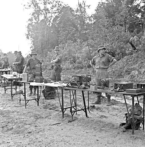 BRITISH SOLDIERS IN A TRAINING DEMONSTRATION OF JUNGLE WARFARE AT ULU TIRAM JUNGLE WARFARE SCHOOL