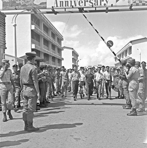 THE SCENE OUTSIDE SINGAPORE ARMED FORCE'S BEDOK CAMP AND CAMPS THROUGHOIUT THE ISLAND AS SINGAPORE'S 'FIRST 1,000' NATIONAL SERVICEMEN RETURNED TO CIVILIAN LIFE. FOR THE COMMANDING OFFICERS AS WELL AS THE MEN, PARTING AT THE GATES MARKED A MEMORABLE MOMENT. ONLY TWO YEARS AGO THEY HAD BEEN THE FIRST TO BUILD THE NUCLEUS OF THE REPUBLIC'S 'CITIZENS' ARMY