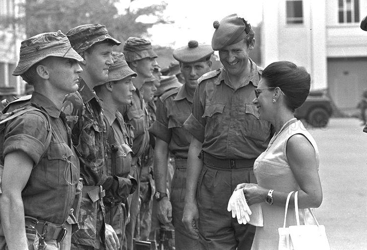 PRINCESS MARGARET'S OFFICIAL VISIT TO SINGAPORE. PICTURE SHOWS PRINCESS MARGARET INSPECTING THE FUSILIERS 'A' COMPANY IN JUNGLE FATIGUES PREPARING FOR 28 AUSTRALIAN NEW ZEALAND UNITED KINGDOM (ANZUK) BRIGADE EXERCISE AT NEE SOON CAMP