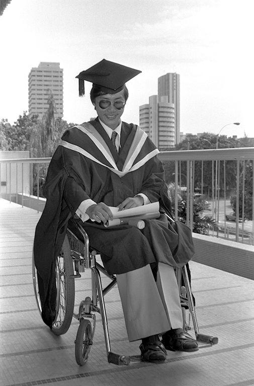ERIC CHEW WAH HENG, A PARAPLEGIC SCHOLAR WHEELED HIS WAY ACROSS THE STAGE TO RECEIVE HIS GRADUATION SCROLL ON CONVOCATION DAY. GRADUATION FOR ERIC SPELT THE TRIUMPH OF FOUR YEAR'S HARD STRUGGLE AS HE BECAME AN ACCOUNTANCY GRADUATE AT THE UNIVERSITY OF SINGAPORE CONVOCATION HELD AT THE SINGAPORE CONFERENCE HALL