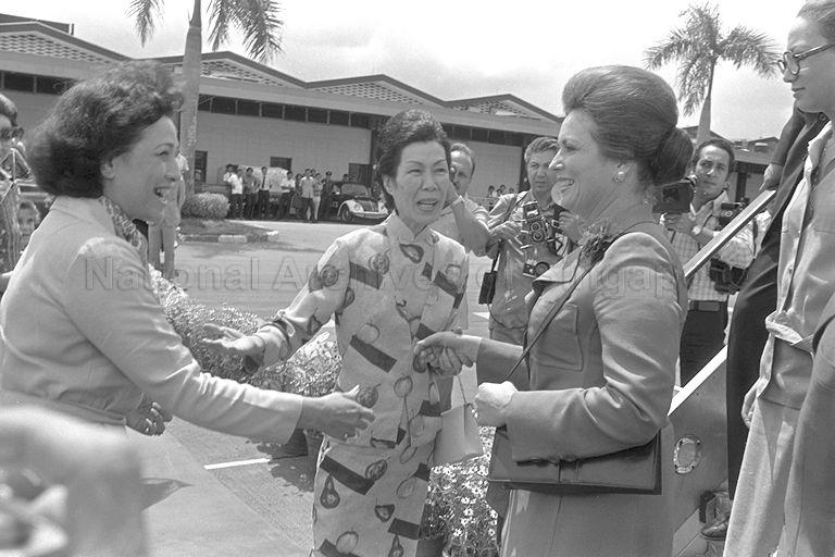 ARRIVAL OF MRS JEHAN EL SADAT, WIFE OF PRESIDENT SADAT OF EGYPT AT THE AIRPORT. SHE WAS GREETED BY FIRST LADY MRS BENJAMIN HENRY SHEARES AND WIFE OF MINISTER FOR LAW AND ENVIRONMENT MRS E W BARKER