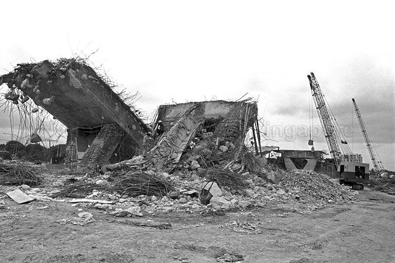 WORK HAS BEGUN TO CLEAR THE HUGE MASS OF PRE-STRESSED CONCRETE BEAMS AT THE COLLAPSED FLYOVER AT JALAN EUNOS, AND CONSTRUCTION OF THE OVERPASS IS EXPECTED TO RESUME IN TWO MONTHS. DEMOLITION CRANES ARE SEEN BEING USED TO SMASH THE DAMAGED BEAMS INTO SMALLER BITS
