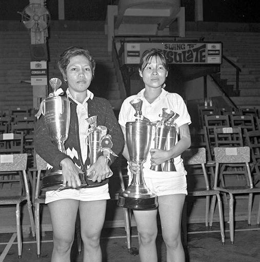 WINNERS IN THE LADIES SECTION AT THE SINGAPORE OPEN BADMINTON CHAMPIONSHIPS HELD AT THE SINGAPORE BADMINTON HALL. SINGAPORE CHAMPION LIM CHOO ENG (RIGHT) BEAT AISHAH ATTAN 11-6, 11-3