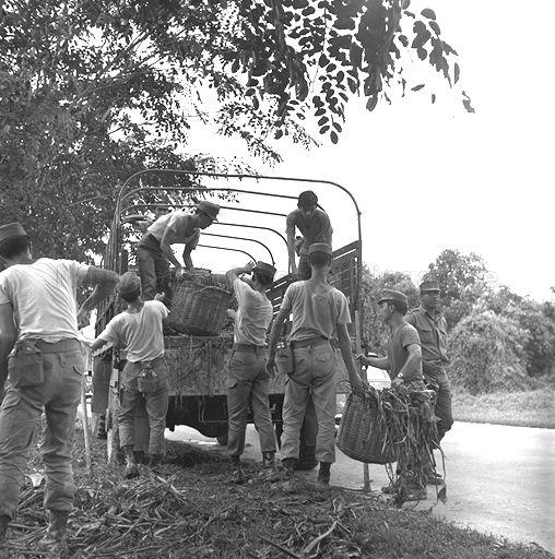 OVER 800 NATIONAL SERVICEMEN HELPED IN 'OPERATION CLEAN-UP' TO CLEAR DEBRIS LEFT BY FLOODS. TAKING PART IN THE TWO-DAY OPERATION ARE FIVE COMPANIES OF TROOPS FROM BEDOK CAMPS 1 AND II, GUILLEMARD CAMP AND THE SINGAPORE ARMED FORCES INSTITUTE. THEY ARE USING A FLEET OF 37 THREE-TON MILITARY TRUCKS. PICTURE SHOWS TROOPS FROM BEDOK CAMP 1 CLEARING AWAY WATER HYACINTH CHOKING UP THE DITCH AT NINE AND A HALF MILE, CHANGI ROAD