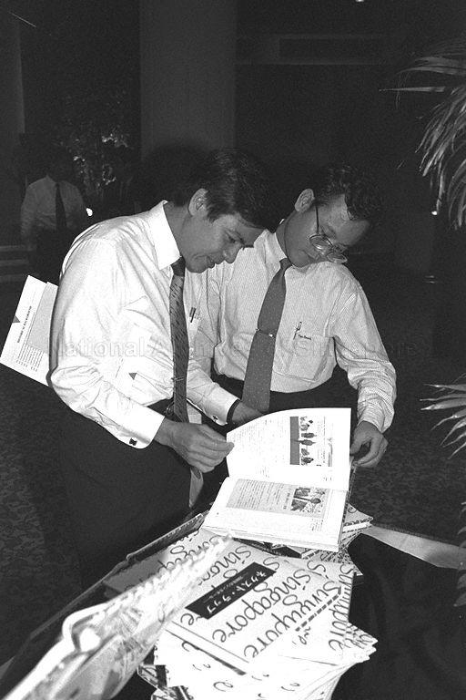 JAPANESE CHAMBER OF COMMERCE AND INDUSTRY (JCCI) SINGAPORE FOUNDATION SECOND ANNUAL DONATIONS AND AWARDS PRESENTATION CEREMONY 1992 AT PAN PACIFIC HOTEL - PICTURE SHOWS GUESTS LOOKING AT PUBLICATION