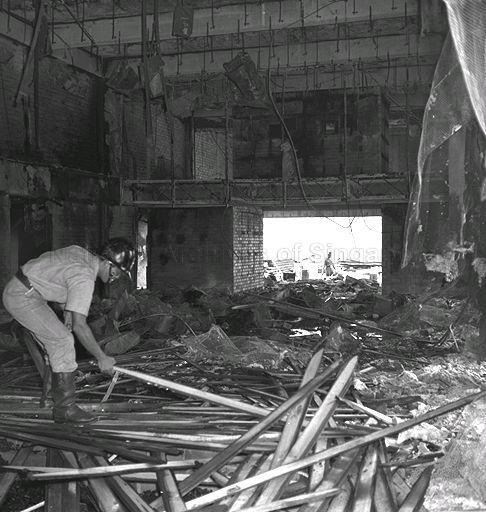 A TWO-HOUR FIRE DESTROYED A MULTI-PURPOSE HALL ON THE TOP FLOOR OF THE NEARLY COMPLETED 22-STOREY HEADQUARTERS OF THE MINISTRY OF NATIONAL DEVELOPMENT CAUSING DAMAGE ESTIMATED AT $100,000. POLICE SUSPECT ARSON AND HAVE DETAINED A MAN. WOODEN PANELLING AIR-CONDITIONING FITTINGS AND SOME EXPENSIVE EQUIPMENT STORED IN THE HALL WERE COMPLETELY DESTROYED