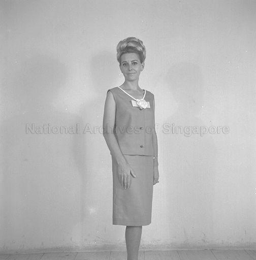 MRS MELBA FLINTON IN CHERRY RED OUTFIT WITH WHITE ORGANDIE BOW AND ROSEETTA. THE PLAINEST DRESS CAN SET OFF A PRETTY NOTE WITH AN INTERESTING NECKLINE. THE CLOTHES PRESENTED BY HILDA'S OFTEN EMERGE STARKLY SIMPLE WITH ONLY A TOUCH OF WHITE TO RELIEVE THE ONE-COLOUR THEME. COLOURS LIKE CHERRY RED AND NAVY ARE CONTRASTED WITH WHITE WHILE SUN-FLOWER YELLOW IS SET OFF BY BLACK AND WHITE. COLLARS ARE STILL VERY MUCH IN FASHION - THOUGH NOT SO BIG AND FLOPPY. THEY HELP CREATE AN ULTRA SMART LOOK TO ANY OUTFIT. POPULAR FOR DAYTIME, THEY ARE OFTEN USED FOR COCKTAIL SUITS. BOWS TOO, HAVE A FIRM PLACE IN FASHION