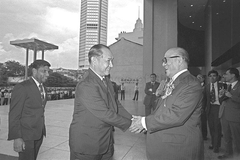TAN CHIN TUAN (RIGHT), MILLIONAIRE BANKER-PHILANTHROPIST AT THE OPENING OF THE 52-STOREY OVERSEAS-CHINESE BANKING CORPORATION (OCBC) CENTRE IN THE HEART OF SINGAPORE'S BUSINESS DISTRICT. THE $100 MILLION SKYSCRAPER IS THE TALLEST BUILDING IN SINGAPORE. PICTURE SHOW HIM SHAKING HANDS WITH HOWE YOON CHONG. ON THE LEFT IS S DHANABALAN