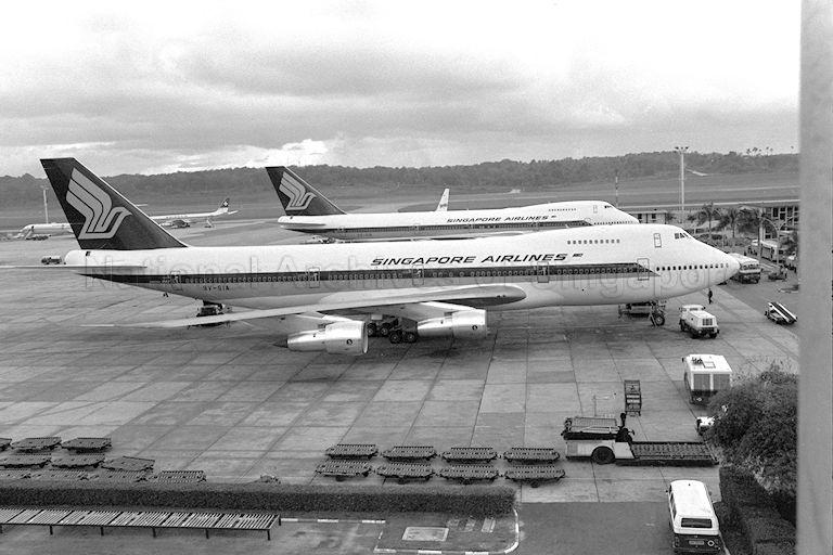 SIDE BY SIDE AT HOME IN SINGAPORE AIRPORT - SINGAPORE AIRLINES' (SIA) FIRST TWO JUMBO JETS FROM SEATTLE. THE TWO BOEING 747S WHICH FLEW IN FROM OPPOSITE DIRECTIONS TO MEET HERE AT 4 PM WILL OPERATED FROM OCTOBER 1 ON SIA'S THREE MAJOR INTERNATIONAL SECTORS