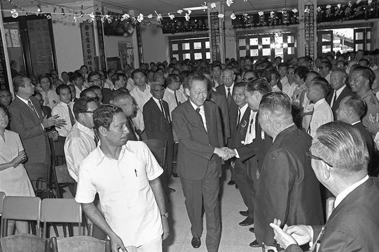 PRIME MINISTER LEE KUAN YEW AT THE 44TH ANNIVERSARY OF NANYANG KHEK COMMUNITY GUILD, WHICH ALSO MARKS THE COMPLETION OF EXTENSIONS TO ITS PREMISES IN PECK SEAH STREET. HE WAS WARMLY GREETED BY OFFICIALS OF NANYANG KHEK COMMUNITY