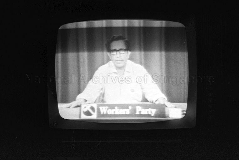 J B JEYARATNAM OF THE WORKERS PARTY SPEAKING DURING A POLITICAL PARTY BROADCAST OVER TELEVISION SINGAPURA
