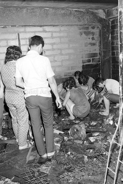 KHAW AH CHEW AND FAMILY TRYING TO SALVAGE WHATEVER THEY COULD FROM THEIR GUTTED FLAT AT BLOCK 44, LORONG 5, TOA PAYOH. SEVEN CHILDREN AND A HOUSEWIFE WERE RESCUED BY FIREMEN FROM A FIRE WHICH TRAPPED THEM IN THEIR ADJOINING HOUSING AND DEVELOPMENT BOARD (HDB) FLATS. NTE THE BARE BRICK WALL, WHICH WAS STRIPPED OF PLASTER BY THE INTENSE HEAT FROM THE FIRE. THE FIRE STARTED FROM KHAW'S FLAT BEFORE SPREADING TO THE NEXT-DOOR NEIGHBOUR. FORTUNATELY, NO ONE WAS SERIOUSLY INJURED