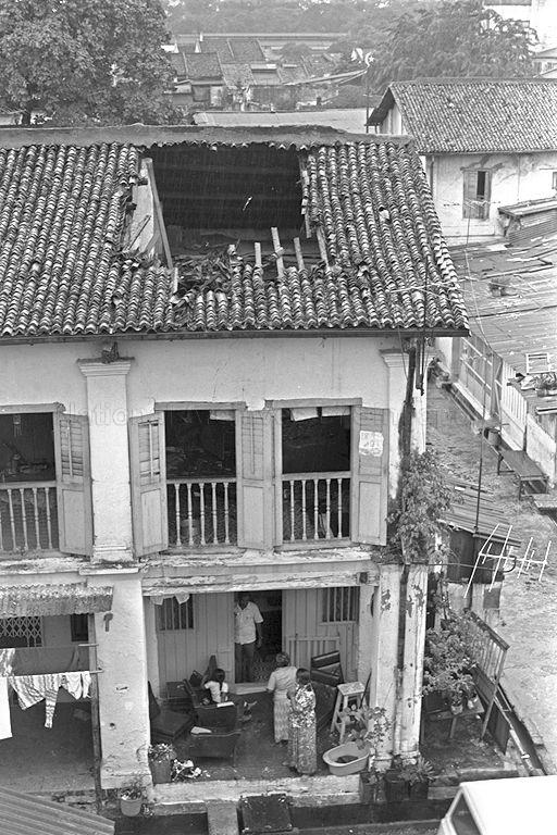 THREE CAR WASHERS HAD A NARROW ESCAPE WHEN A PORTION OF THE ROOF OF THEIR DOUBLE-STOREY PRE-WAR HOUSE IN ROTAN LANE, OFF RACE COURSE ROAD COLLAPSED IN HEAVY RAIN. PICTURE SHOWS THE PORTION OF THE ROOF WHICH GAVE WAY DURING THE RAIN