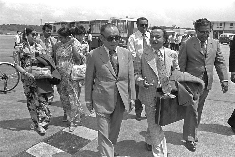 ARRIVAL OF SRI LANKAN FOREIGN AFFAIRS MINISTER A C S HAMEED (SECOND RIGHT) AND WIFE (EXTREME LEFT) AT THE SINGAPORE AIRPORT. THE WERE GREETED BY SENIOR MINISTER OF STATE FOR FOREIGN AFFAIRS LEE KHOON CHOY (THIRD RIGHT). MR HAMEED IS HERE ON A FIVE-DAY VISIT