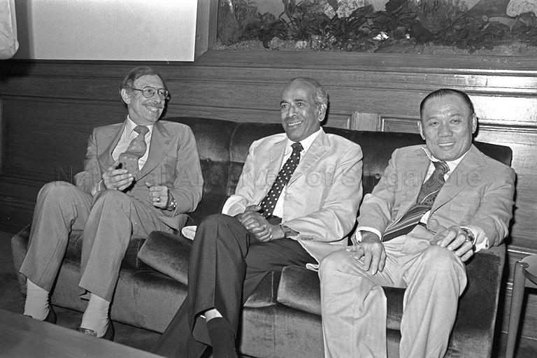 UNITED STATES CONGRESSMAN LESTER WOLFF (LEFT) CALLS ON MINISTER FOR FOREIGN AFFAIRS S RAJARATNAM (CENTRE) AT CITY HALL. HE IS ALSO CHAIRMAN OF THE SUB-COMMITTEE ON ASIAN AND PACIFIC AFFAIRS. HE IS HERE WITH FOURTEEN OTHER CONGRESSMEN ON A FACT-FINDING MISSION. ON THE RIGHT IS SENIOR MINISTER OF STATE FOR FOREIGN AFFAIRS LEE KHOON CHOY