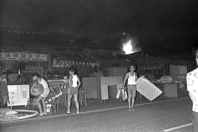 A FIRE BROKE OUT AT BEAUTY WORLD PARK MARKET IN BUKIT TIMAH. SHOPKEEPERS SALVAGING THEIR BELONGINGS AS THE FLAMES DRAW NEAR. THE FIRE IS BELIEVED TO HAVE STARTED FROM A STALL SELLING BANANAS. A FIREMAN AND TWO OTHER PEOPLE WERE SLIGHTLY INJURED