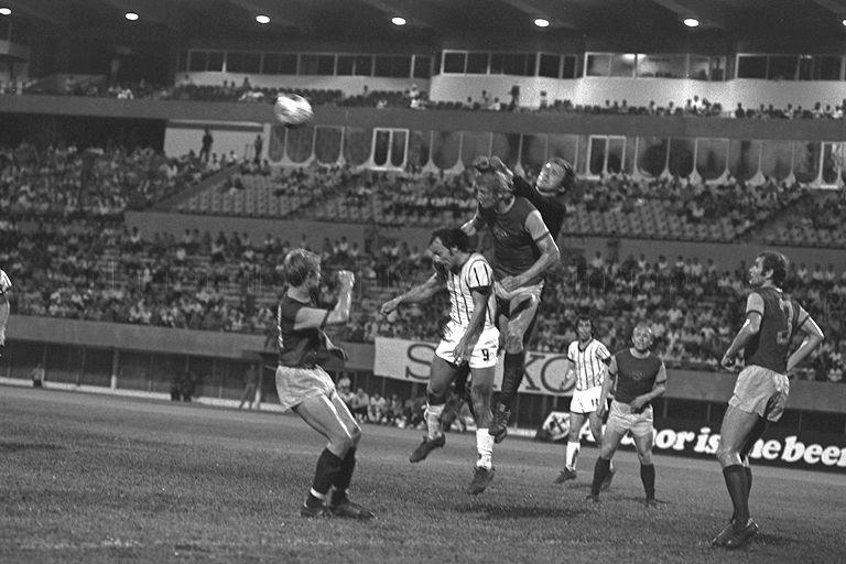 FIRST LEG OF THE EURO-ASIA SOCCER FINAL BETWEEN DUKLA PRAGUE OF CZECHOSLOVAKIA AND JULICH FOOTBALL CLUB (FC) FROM GERMANY HELD AT THE NATIONAL STADIUM. DUKLA PRAGUE GOALKEEPER IVO VIKTOR LEAPS HIGH TO BEAT HIS FULLBACK STAMBACHER (IN THE CENTRE) AND JULICH FORWARD (IN STRIPES) TO PUNCH CLEAR THIS CORNER KICK. DUKLA PRAGUE BEAT JULICH FC 3 - 0