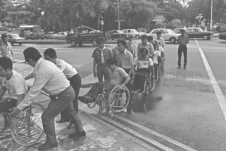 10 HANDICAPPED MEN - PARAPLEGIC AND BLIND, WHISTLED AND SANG AS THEY FILED DOWN ORCHARD ROAD FOR A TRIAL RUN OF THEIR FORTHCOMING 'BLINDWHEELATHON'. STARTING AT THE ORCHARD MALL AT CUSCADEN ROAD, FIVE PARAPLEGICS GUIDED THEIR BLIND PARTNERS WHO PUSHED THEIR WHEELCHAIRS DOWN THE MALL, TAKING THE STEPS AND OTHER OBSTACLES IN THEIR STRIDE