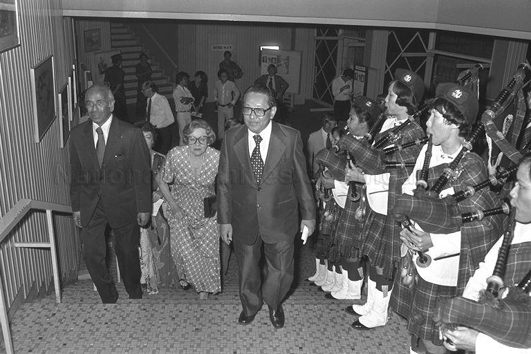 BAGPIPES SKIRL AS THE MINISTER FOR FOREIGN AFFAIRS S RAJARATNAM (LEFT) AND HIS WIFE ARRIVE AT THE VICTORIA THEATRE FOR THE WORLD PREMIERE OF THE MUSICAL 'LION OF SINGAPORE'. THE 'LION OF SINGAPORE' IS A MODERN-DAY MUSICAL REVOLVING ROUND THE EARLY PROBLEMS THAT SINGAPORE'S FOUNDER SIR STAMFORD RAFFLES FACED