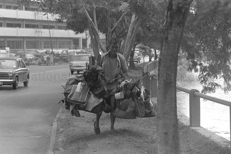 A 'TRASH-MAN' CARRYING DISCARDED ITEMS WALKING ALONG ROCHORE CANAL