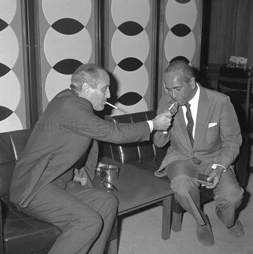 ARRIVAL OF TUNISIAN FOREIGN MINISTER HABIB BOURGUIBA JR (LEFT) AT SINGAPORE AIRPORT. HE WAS GREETED BY MINISTER FOR FOREIGN AFFAIRS S RAJARATNAM. MR BOURGUIBA IS HERE ON A GOODWILL VISIT TO MAKE UP FOR THE ABSENCE OF PERMANENT DIPLOMATIC REPRESENTATION IN THIS REGION