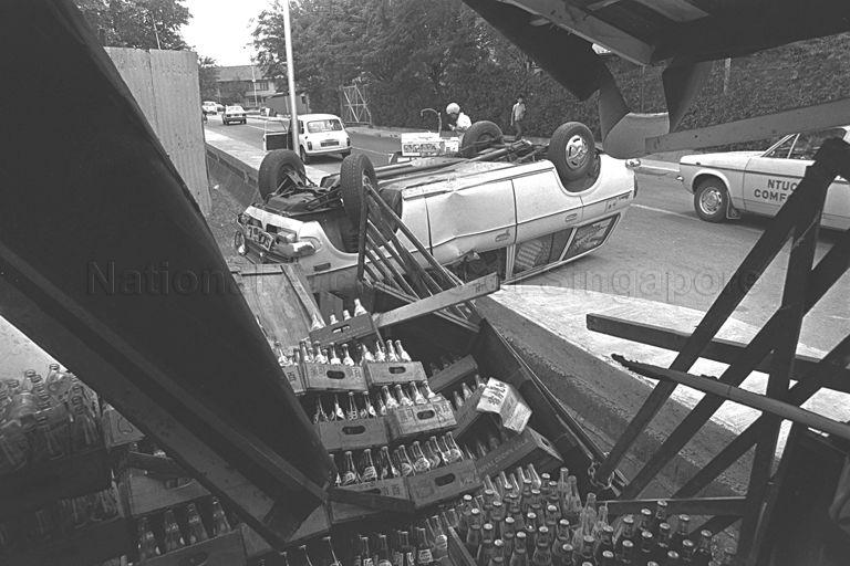 ACCIDENT AT KALLANG PUDDING ROAD. COFFEE STALL OWNER TAN THIAN HUAT, 34, AND FIVE OF HIS CLIENTS HAD A NARROW BRUSH WITH DEATH WHEN A STATION WAGON HIT THEIR STALL AND OVERTURNED. THE VEHICLES HAD SECONDS EARLIER COLLIDED WITH A DATSUN PICK-UP VAN BEFORE RAMMING INTO THE COFFEE STALL