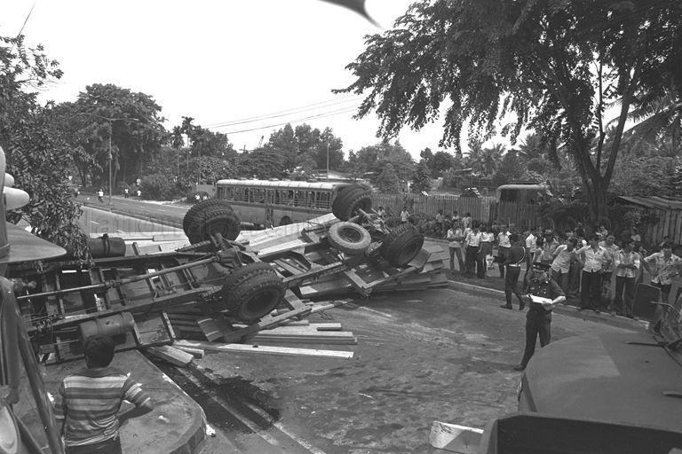 ACCIDENT INVOLVING A LORRY-TRAILER AND A MILITARY TRUCK AT UPPER BUKIT TIMAH ROAD. MASHUD BIN KASIRONG, THE DRIVER OF THE LORRY AND HIS ATTENDANT WERE INJURED WHEN THE LORRY OVERTURNED AFTER THE COLLISION. THEY WERE TAKEN TO THE SINGAPORE GENERAL HOSPITAL