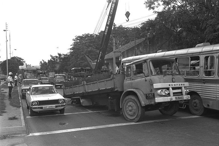 A TWO-KILOMETRE LONG TRAFFIC JAM BUILT-UP ALONG LORNIE AND BRADDELL ROADS AFTER A LORRY LOST ALL ITS FOUR WHEELS NEAR THE FLYOVER ALONG BRADDELL ROAD. THE DRIVER, LOW AH KOK, SAID HE WAS SLOWING DOWN TO A HALT AT THE TRAFFIC LIGHTS WHEN HE FELT THE REAR END OF HIS VEHICLE SLIDING DOWN