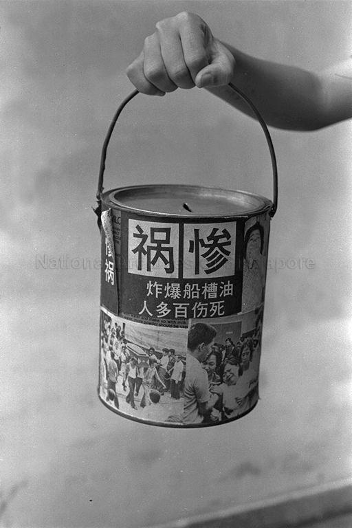 THE SPYROS DISASTER - WITH A TIN PASTED WITH NEWSPAPER CUTTINGS SHOWING VICTIMS OF THE SPYROS DISASTER, LIM SOO HEANG, 19, AND TEO KAY HOCK, 32, MANAGED TO 'RAISE' $43.30 BEOFRE POLICE RECEIVING A COMPLAINT ARRESTED THEM