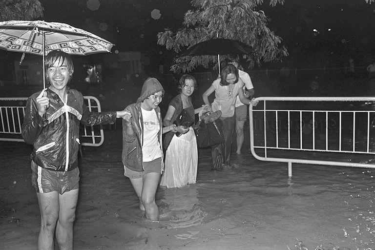 PREMATURE ARRIVAL OF TORRENTIAL MONSOON RAINS WREAKED UTTER CHAOS THROUGHOUT SINGAPORE, WITH ROADS SUBMERGED UNDER A METRE OR MORE OF WATER. FLOOD WATERS SWEPT INTO MANY HOUSING ESTATES, POURING INTO LOW-LYING HOMES, TURNING GARDENS INTO PONDS. IT TOOK PEOPLE HOURS TO GET TO NEARBY PLACES AND THEY COULD ONLY DO SO BY WALKING OR WADING THROUGH METRE-DEEP WATER