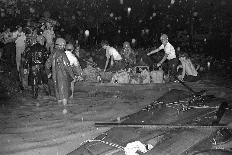 RESCUED FROM THE FLOODSý.THESE RESIDENTS OF POTONG PASIR WADE THROUGH WAIST-DEEP WATERS YESTERDAY O AN SINGAPORE ARMED FORCES ASSAULT BOAT WHICH CAME BY TO PICK UP THE FLOOD VICTIMS