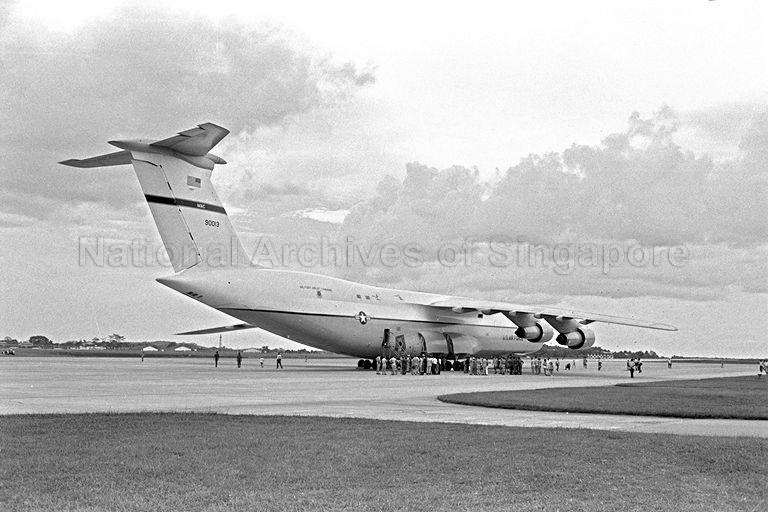 THE WORLD'S LARGEST AIRCRAFT, THE LOCKHEED GALAXY C-5 AT THE ROYAL AIR FORCE (RAF) TENGAH AIR BASE, SINGAPORE. ON THE APRON, THE GALAXY C-5 DWARFS EVERYTHING IN SIGHT, THE JUMBO OR BOEING 747 INCLUDED