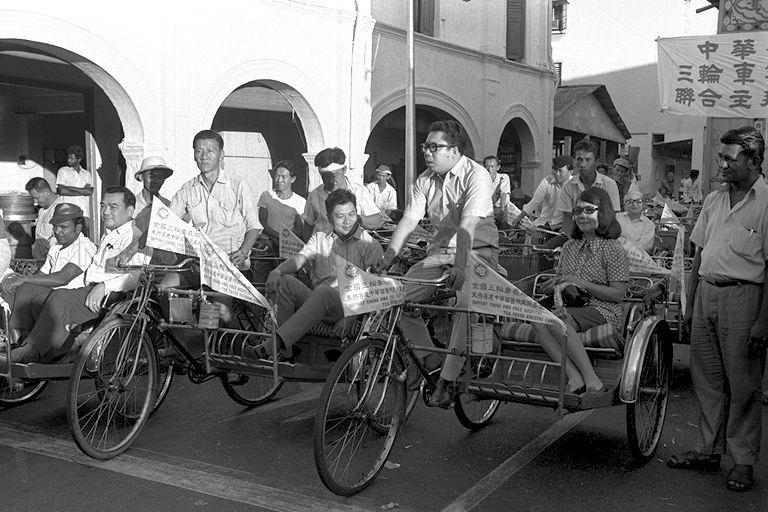 SOME 1,000 TRISHAW RIDERS TOOK PART IN A CHARITY RIDE IN AID OF THE PROPOSED CHUNG HWA FREE HOSPITAL IN TOA PAYOH. PICTURE SHOWS PARLIAMENTARY SECRETARY TO MINISTRY OF SOCIAL AFFAIRS CHAN CHEE SENG (SEATED ON SECOND TRISHAW ON RIGHT) WHO STARTED THE CEREMONY. MADAM CHAN CHOY SIONG (RIGHT) IS SEATED IN A TRISHAW PEDALLED BY SIM BOON WEE, MEMBER OF PARLIAMENT FOR CHANGI